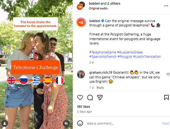 Babbel invests in its videos, but doesn't follow a particular strategy or tone. They have a few videos with views in millions, but others barely get a few thousand views despite their Instagram following of 400k+.