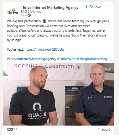 Let's say you're an HR tech company. You can post a video ad showing a client's success story or highlight key industry data in a 30-second explainer. For example, Thrive Marketing posts videos of its new client relationships. These videos can be turned into social ads and targeted to stakeholders in the same industry to attract them.