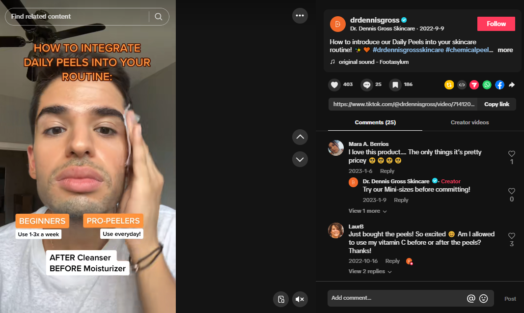 We’ve already covered above how product demos can be made into shoppable videos. These are short demonstrations that answer one question at a time, such as a makeup video showing how a foundation applies in under a minute. Here’s a good example from Dr. Dennis Gross.