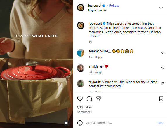 Le Creuset focuses on color variants in its videos since that’s what gets purchase decisions made among its audience.